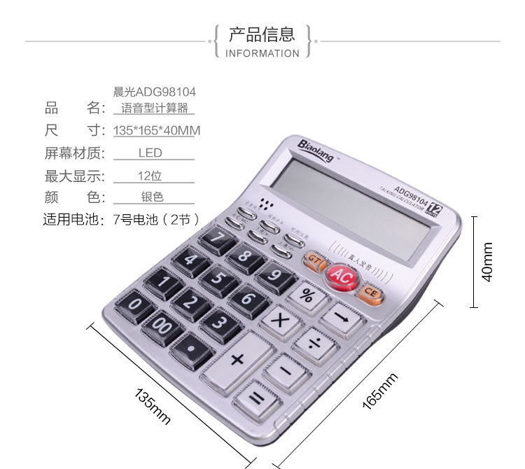 • 商品名称:晨光(M&G)经典语音型桌面办公计算器 12位大屏幕ADG98104