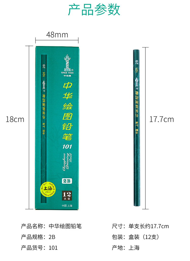 • 商品名称:中华 101 2B 绘图铅笔/考试铅笔 12支/盒